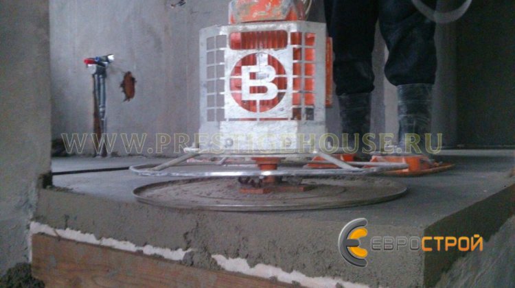 Для того, чтобы выполнить заливку всей площади первого этажа понадобилась бригада из 5 человек и специальная техника: пневмонагнетатель и затирочная машина «вертолет». В пневмонагнетателе был приготовлен раствор полусухой стяжки. В раствор была добавлена фибра и пластификатор – это значительно увеличило марочную прочность бетона, а также ускорило процесс затвердевания. После этого, с помощью пневмонасоса пол в коттедже равномерно уложили и затем выровняли затирочной машиной.