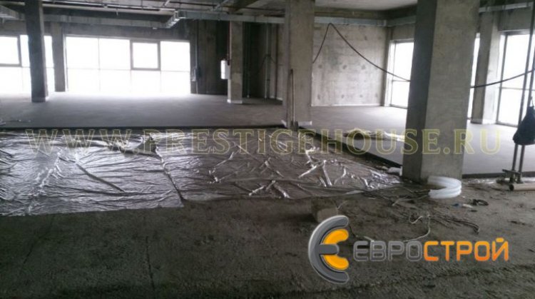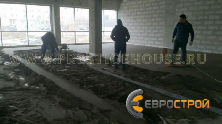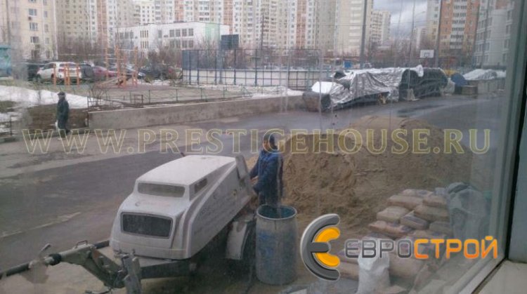 Несмотря на то, что наша компания выполняет работы по устройству полусухой стяжки пола круглый год, при наступлении потепления в центральном регионе России, наши услуги становятся намного популярнее, чем в зимнее время. В очередной раз мы закончили работы по выравниванию пола полусухим методом в городе Наро-Фоминске. Город Наро-Фоминск находится всего в 56 километрах от МКАД, население - около 63 000 человек. Наша компания уже не один раз осуществляла выезд в Наро-Фоминск для проведения работ по заливке пола. В этот раз мы решили рассказать о полусухой стяжке в Наро-Фоминске максимально подробно. Работы проводились в бизнес-центре на общей площади 850 квадратных метров. По результатам замера, проведенного нашим специалистом, средний слой стяжки составил 85 миллиметров. На данный объем нами было завезено и выработано около 100 кубов мытого крупнозернистого песка и около 440 мешков цемента, а также в цементно-песчаный раствор было добавлено около 50 килограмм полипропиленового фиброволокна.