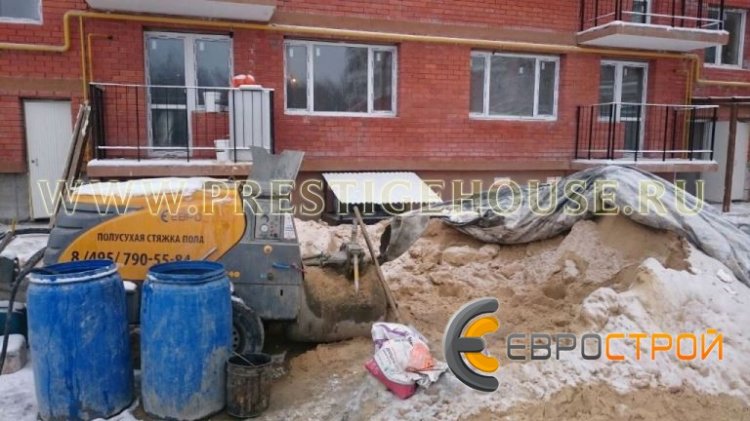 В настоящий момент силами двух бригад залито уже более 15 000 квадратных метров. Стяжка выполняется с использованием немецких растворонасосов Mixman D4 и Putzmeister M740. Окончание работ запланировано на 20 числа декабря. Если Вам необходимо залить качественную и ровную полусухую стяжку в кратчайшие сроки, то наша компания с удовольствием Вам в этом поможет. Наличие 7 профессиональных бригад с собственным оборудованием позволяет нам проводить работы по устройству стяжки одновременно на нескольких объектах в сжатые сроки.