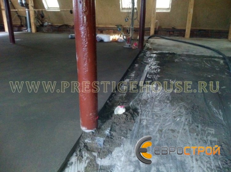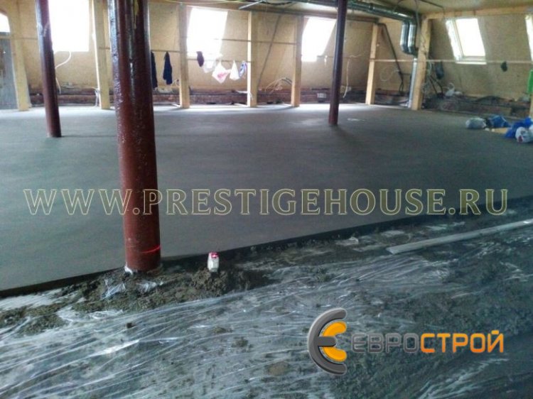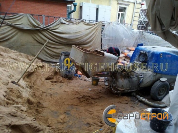 Устройство стяжки проводилось в Центральном Административном округе (ЦАО) г. Москвы рядом с метро Павелецкая. Площадь под заливку составила 680 квадратных метров, средний слой стяжки составил 75 миллиметров. Работы выполнялись с использованием немецкого пневмонагнетателя Brinkmann EB 450 со скипом. Использование скипа в работе пневмонагнетателя позволяет ускорить устройство стяжки на 30 %, благодаря чему весь комплекс работ был закончен за 3 дня.