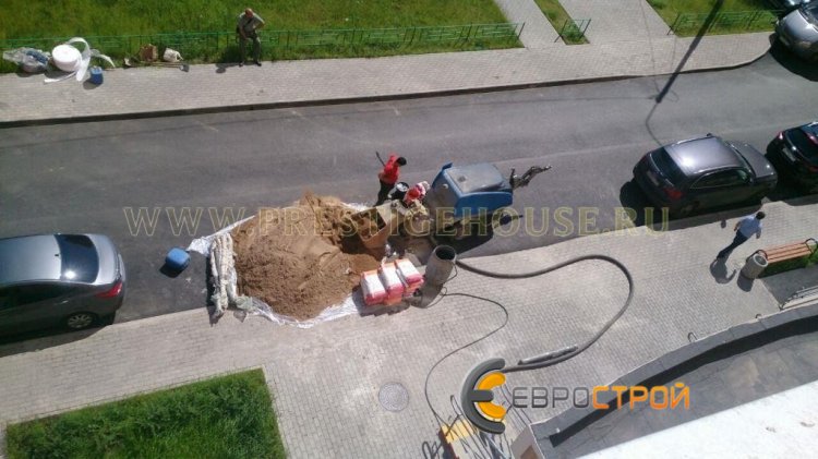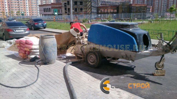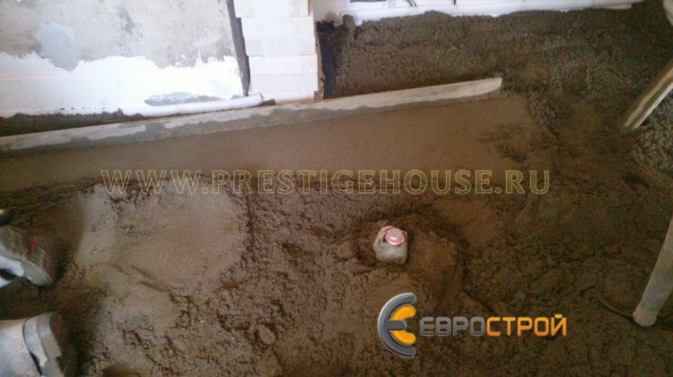 Работы по выравниванию пола проводились силами 1 бригады, общая площадь 45 м2, слой стяжки 68мм, время проведения работ - 5 часов