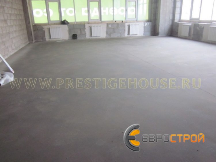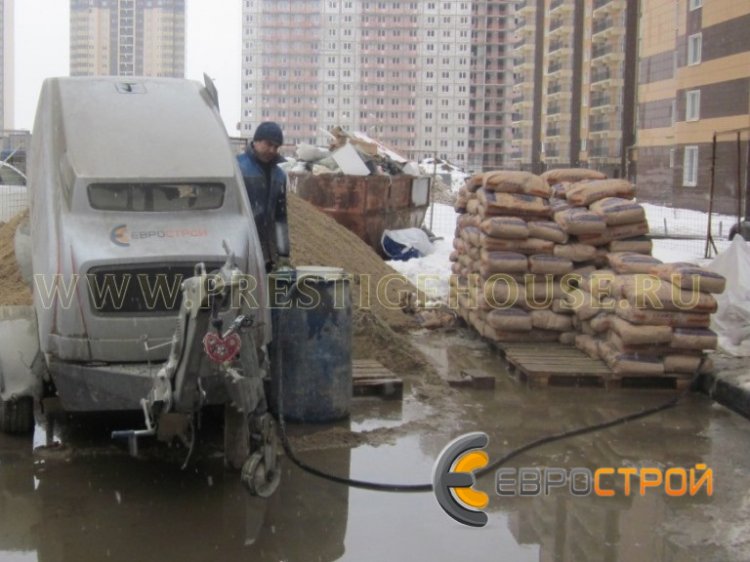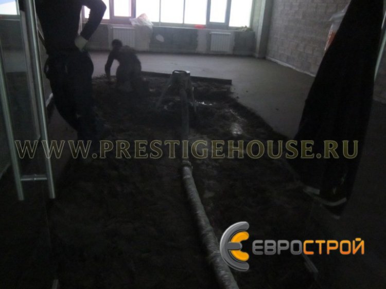 Работы проводились в городе Солнечногорске, который располагается к северо-западу от Москвы в 44 километрах от МКАД. Выравнивание пола в Солнечногорске проводилось силами одной бригады на общей площади 2 200 квадратных метров. По результатам замера, проведенного нашим специалистом и после согласования с Заказчиком, было принято решение, что средний слой стяжки составит 80 миллиметров. Весь комплекс работ был завершен всего за 11 дней. В процессе работ по выравниванию пола нами применялось специализированное оборудование для стяжки, а именно: новейший пневмонагнетатель Mixman D4, производства немецкой фирмы Ludger Glaaр & Fritz Brinkmann. Благодаря техническим особенностям пневмонагнетателя Mixman за один час возможно приготовить и доставить на объект до 5 кубических метров готового цементно-песчаного раствора. Компания «ЕВРОСТРОЙ» использует только надежное немецкое оборудование для устройства полусухих стяжек.