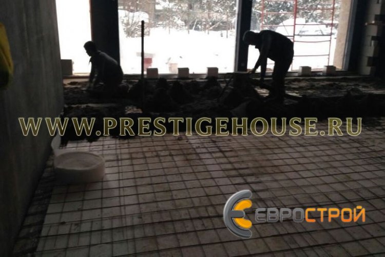 Для многих строительных компаний зима-это время затишья, но только не для наших специалистов. Один из многочисленных объектов, выполненных нашими специалистами в зимнее время, это коттедж в элитном поселке в Жуковке , что в 10 км от МКАДА по Рублево-Успенскому шоссе. Площадь заливки составила 380 квадратных метров, при толщине среднего слоя 65 миллиметров. Весь комплекс работ был выполнен за 3 дня. В ходе работ применялось следующее сырье: цемент М500, мытый песок, полипропиленовая фибра 12 мм, пластификатор, пленка полиэтиленовая, демпферная лента.
