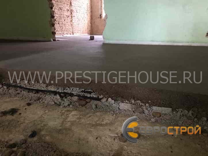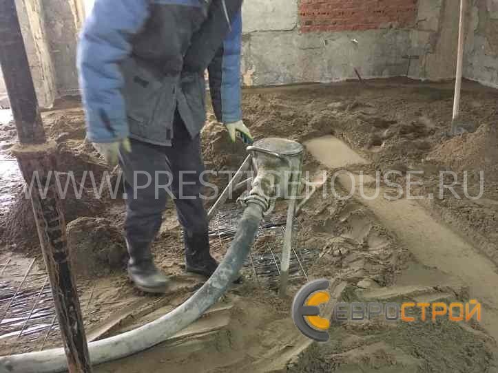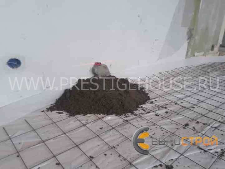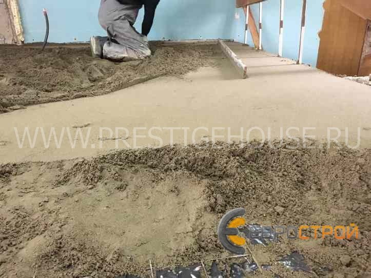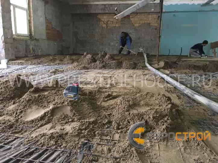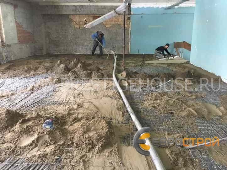 Общая площадь выполняемых работ составляет 4 000 квадратных метров. На данный момент силами одной бригады уже залито более 2 000 метров полусухой стяжки.